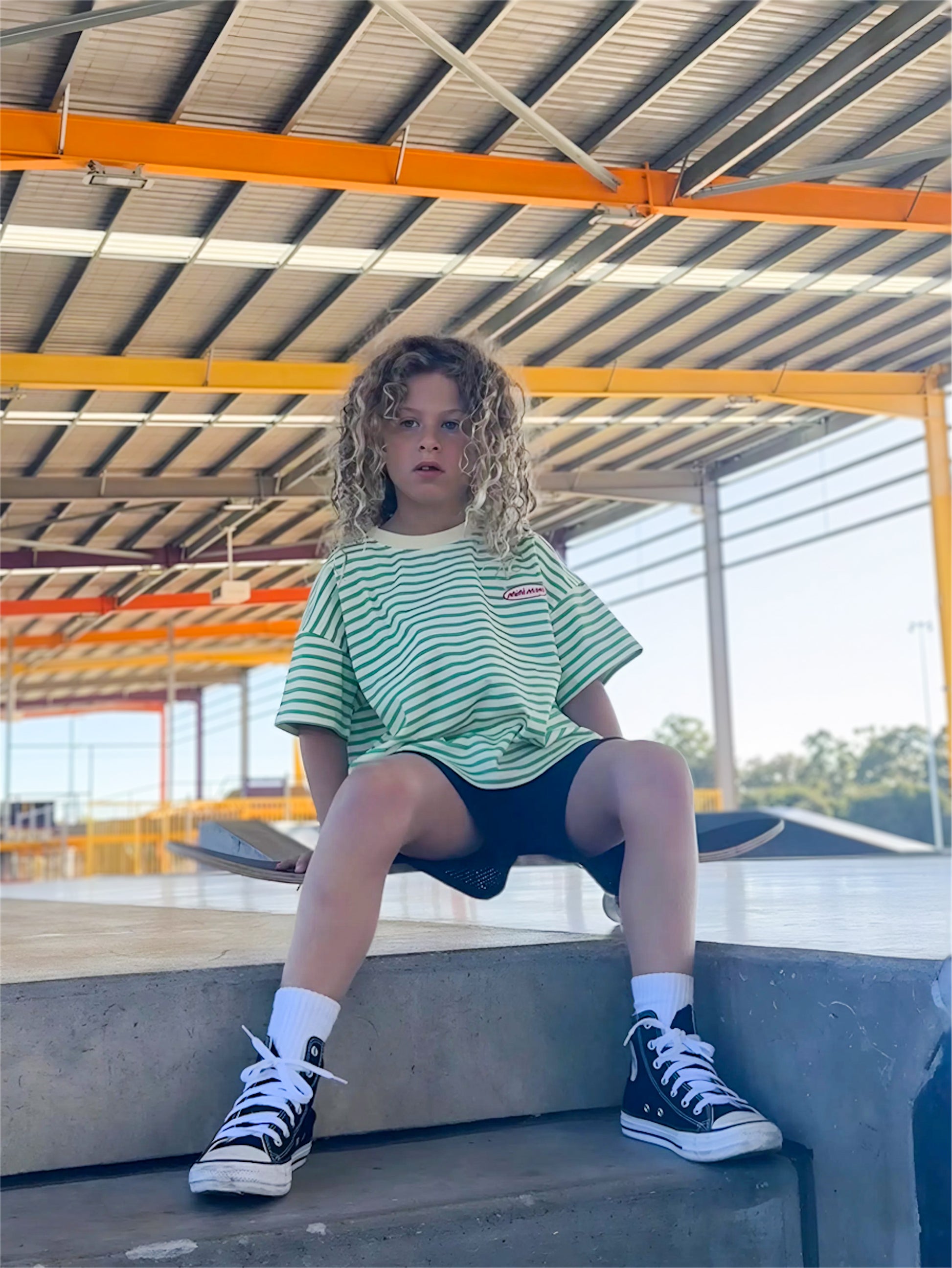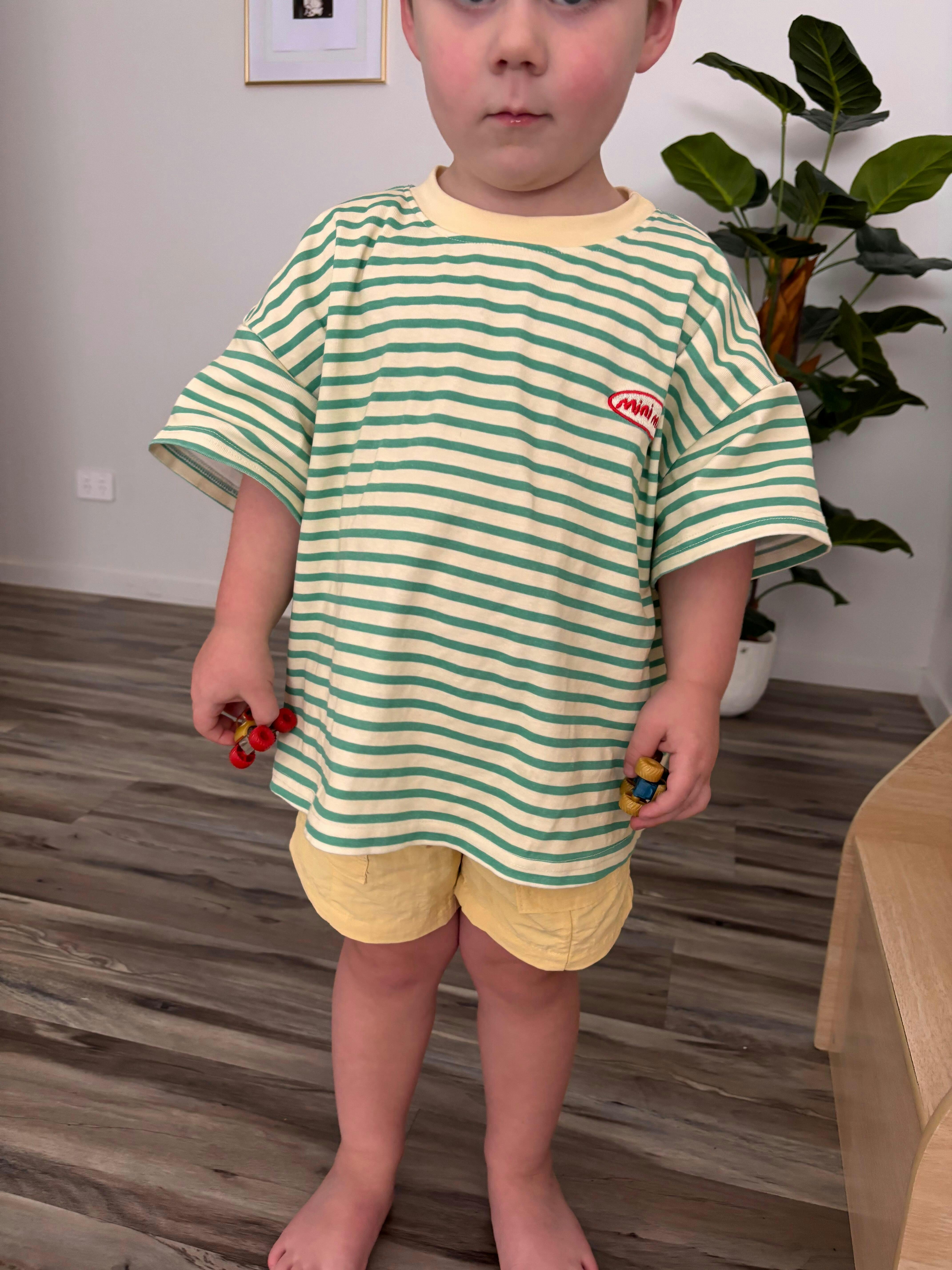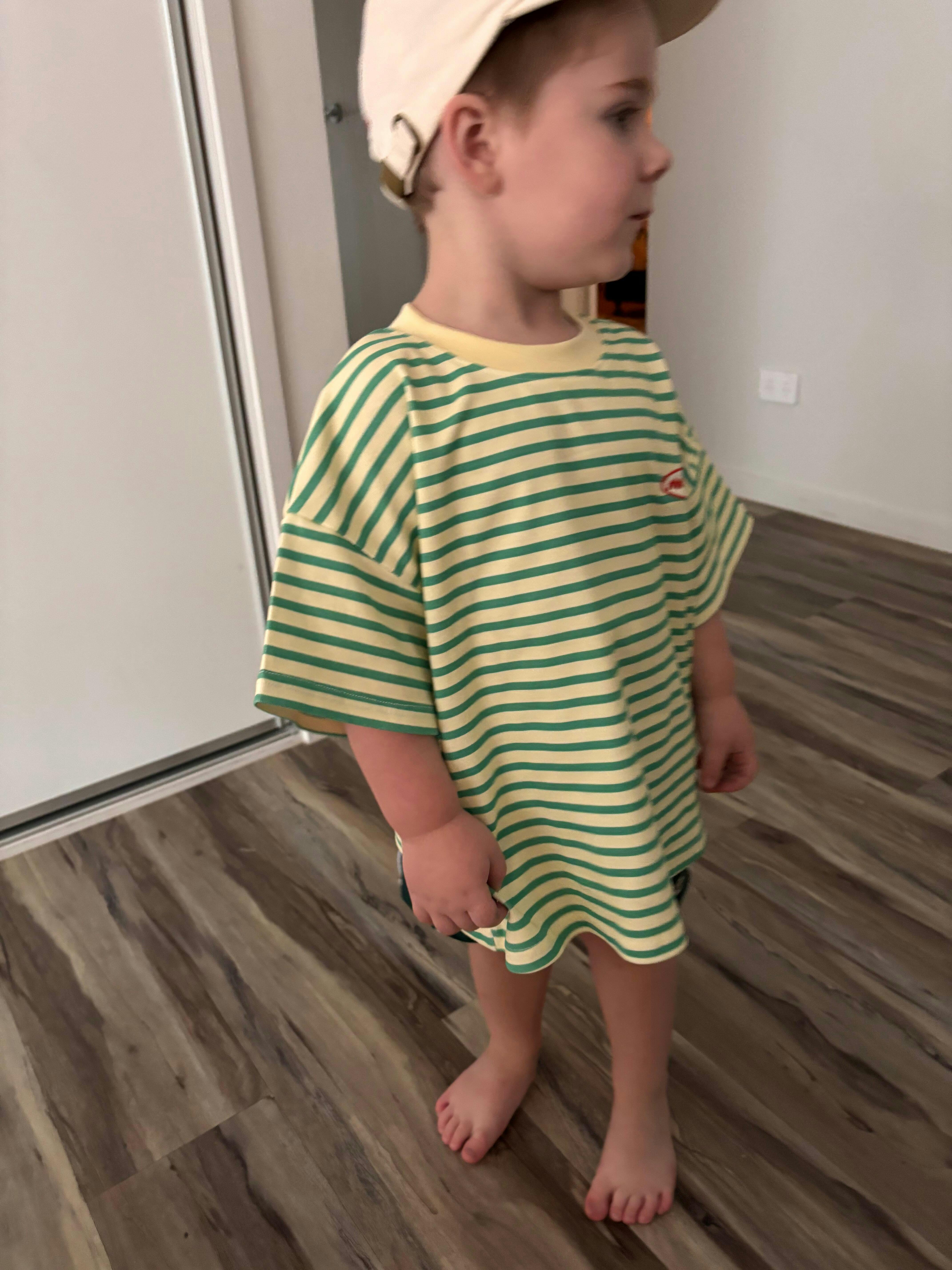 An everyday Stripe with a playful edge. This green and buttery yellow Stripe Tee is an easy throw on relaxed, oversized fit.